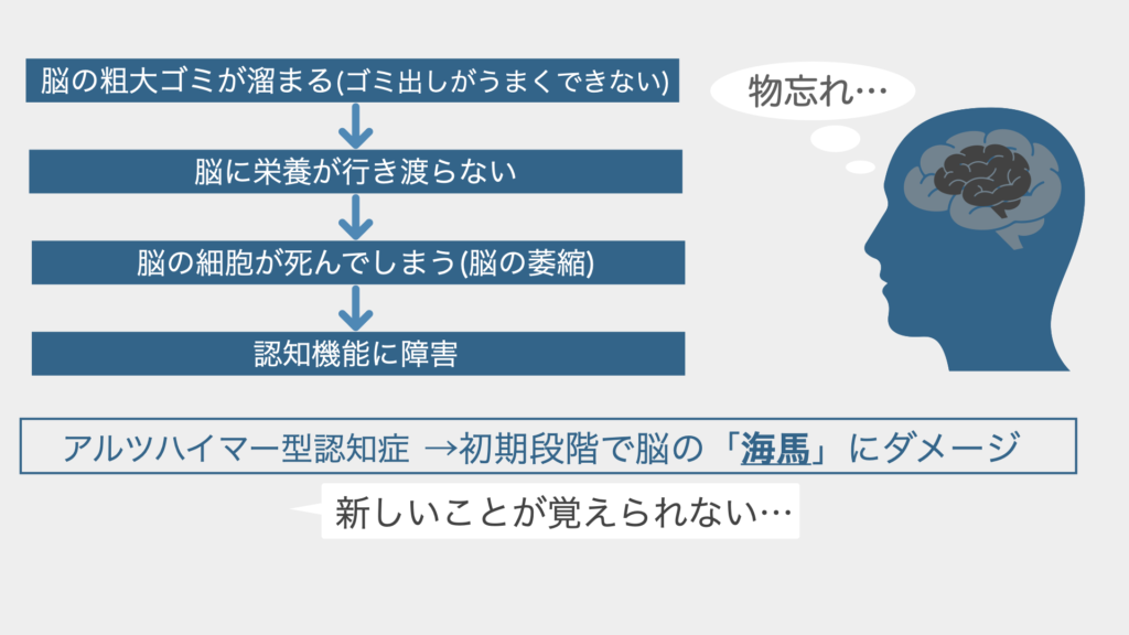 アルツハイマー型認知症では、初期段階で脳の「海馬」という部位がダメージがを受ける、というのが今後の話のキモとなりますので、ぜひ覚えておいてください。