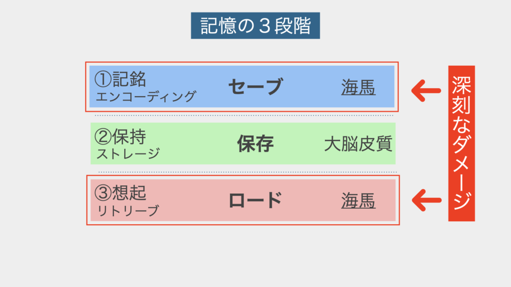①記銘と③想起は海馬の役割→認知症初期にダメージを受けやすい。