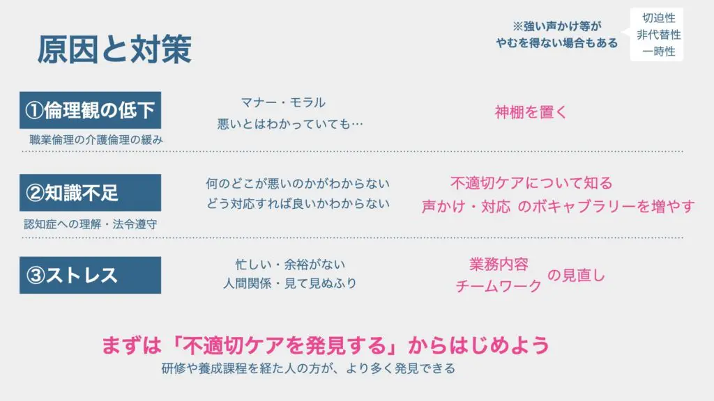 「不適切ケア」を放っておくと「虐待・身体拘束」にエスカレートしてしまう危険性がある、という点を踏まえて、原因と対策を考えてみましょう。